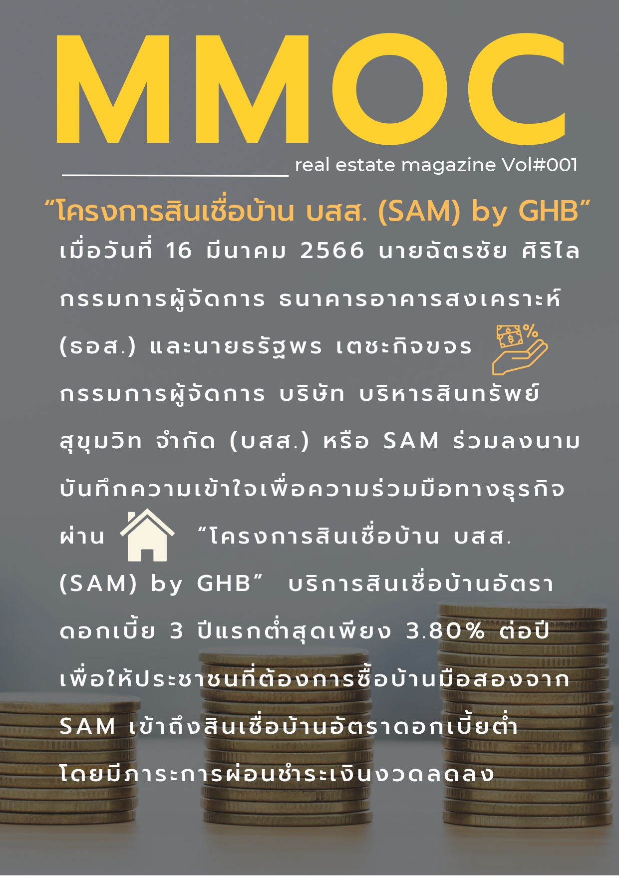 เมื่อวันที่ 16 มีนาคม 2566 นายฉัตรชัย ศิริไล กรรมการผู้จัดการธนาคารอาคารสงเคราะห์ (ธอส.) และนายธรัฐพร เตชะกิจขจร กรรมการผู้จัดการบริษัทบริหารสินทรัพย์สุขุมวิท จำกัด (บสส.) หรือ SAM ร่วมลงนามบันทึกความเข้าใจเพื่อความร่วมมือทางธุรกิจผ่านโครงการ "สินเชื่อบ้าน บสส. (SAM) by GHB" บริการสินเชื่อบ้านอัตราดอกเบี้ย 3 ปีแรกต่ำสุดเพียง 3.80% ต่อปี เพื่อให้ประชาชนที่ต้องการซื้อบ้านมือสองจาก SAM เข้าถึงสินเชื่อบ้านอัตราดอกเบี้ยต่ำโดยมีภาระการผ่อนชำระเงินงวดลดลง ยื่นคำขอกู้อนุมัติและทำนิติกรรมภายในวันที่ 30 ธันวาคม 2567